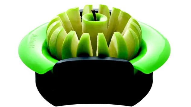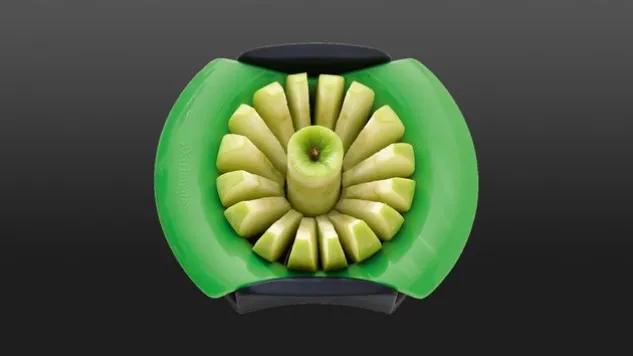 Der Apfelteiler von Triangle brilliert durch die einfache Handhabung. Mit dem Apfelteiler lassen sich 16 Apfelscheiben mit einem Arbeitsgang schneiden.