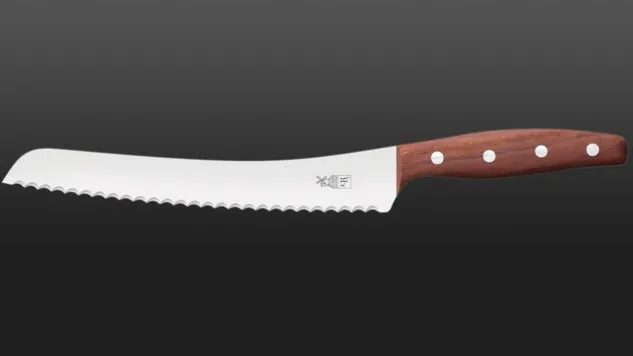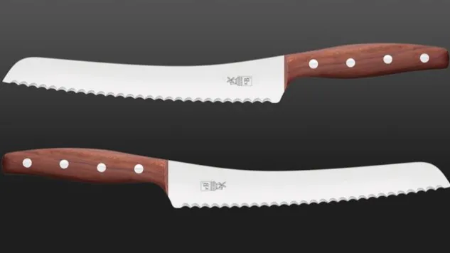 Die rostfreie 23cm Klinge des BrotBeidhänder KB2 Pflaume ist blaugepliesstet, der Griff in hochwertigem Pflaumenholz gefertigt.