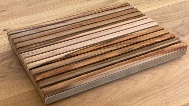 Das Brotbrett klein hat die Masse 36 x 26 x 38 cm und wird aus massivem, satinierten Maser-Walnussholz in Deutschland gefertigt. Das Brotbrett klein verfügt über einen Auffangbehälter aus Edelstahl für die Brotsamen.