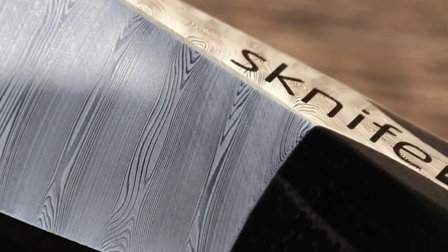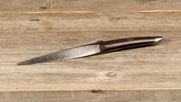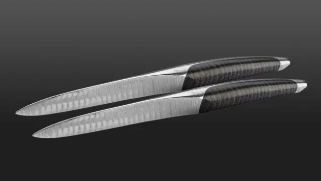 Das Damast Tafelmesserset wird in der Schweiz aus rostfreiem Torsionsdamast gefertigt. Das Damast Tafelmesserset besteht aus zwei Tafelmessern, mit einer Klingenhärte von 60 HRC. Das Design der Messer ist so konzipiert, dass die Klingen berührungslos auf der Tafel liegen.