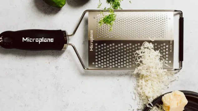 Bei der Doppelreibe sind die beiden Klingenvarianten grob und fein kompakt immer griffbereit: die feine Klinge der Doppelreibe ist ideal zum Reiben von Zitrusfrüchten oder Raspeln verschiedener Gewürze wie Muskat, Zimt, Tonka-Bohne, Schokolade aber auch von Parmesan. Werden Ingwer, Knoblauch oder Chilischoten gerieben, erhält man eine Püree-ähnliche Konsistenz.