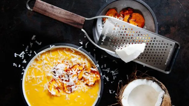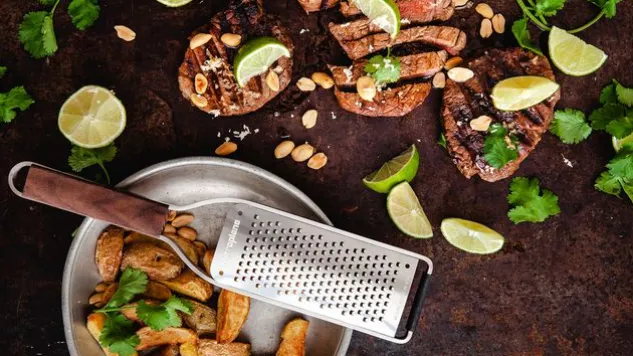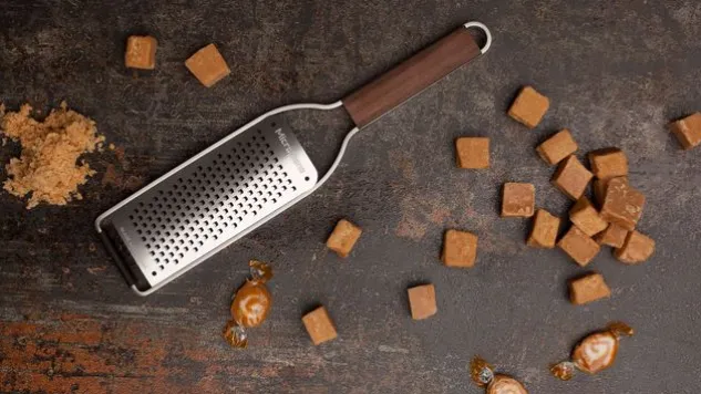 Die Grobe Raspel stammt aus der neuen Master-Serie von Microplane. Der ästhetische Griff aus Walnussholz macht die Grobe Raspel zu einem Design-Küchenhelfer. Der rutschfeste Gummifuss sorgt für stabilen Halt.