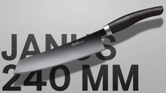 Das Janus Kochmesser bietet ein ausgezeichnetes Wiegegefühl beim Schneiden. Optimiert wird die 24 cm lange Klinge des Janus Kochmessers mit einer DLC-Beschichtung (Diamond-like-carbon), die zu einer enormen Härte und höheren Haftfestigkeit beiträgt.