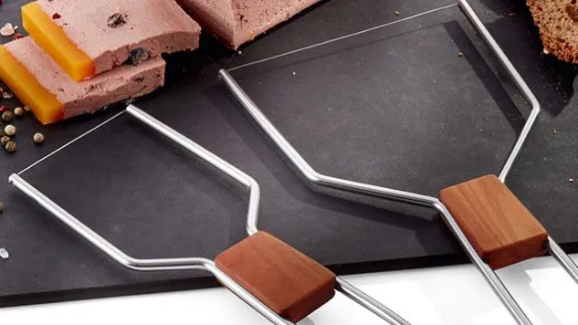 Um die Drahtspannung des Käsedrahtschneiders einzustellen, lässt sich der Holzeinsatz beliebig verschieben. Der schmale Draht des Käsedrahtschneiders, der zwischen den zwei Edelstahlenden gespannt ist, sorgt für einen sauberen Schnitt ohne Ankleben.