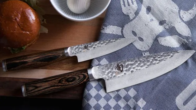 Die Hammerschlagoberfläche der Klingen des Kochmesserset Tim Mälzer ist ein echter Hingucker. Die edlen Pakkaholz-Griffe (Walnussschichtholz mit Kunststoff infiltriert) sorgen für guten Halt beim Schneiden.