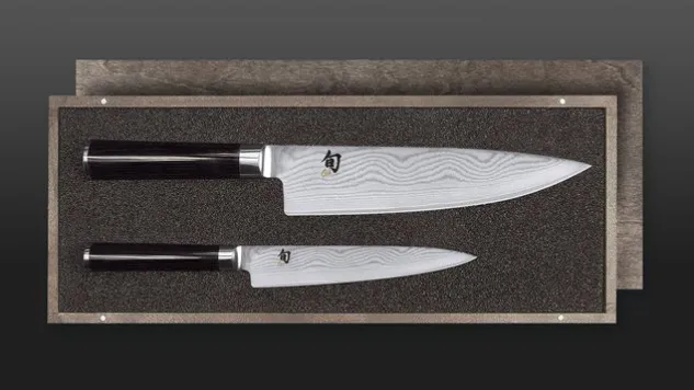 Das Kochmesserset besteht aus dem Kochmesser und dem Allzweckmesser. Die ansprechende Geschenkverpackung aus Holz bildet den würdigen Rahmen für dieses Kochmesserset aus Damaststahl.