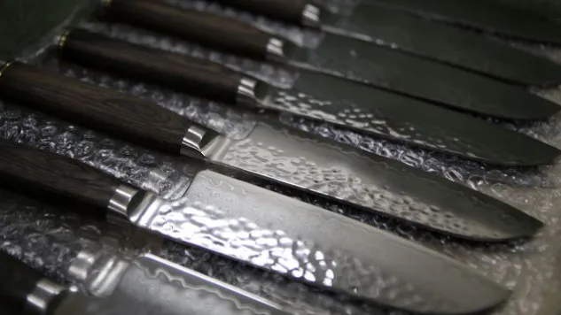 Die mit einer Hammerschlagoberfläche verfeinerten Klingen des Küchenmesserset Tim Mälzer sind mit den edlen Pakkaholz-Griffen (Walnussschichtholz mit Kunststoff infiltriert) ein echter Hingucker.