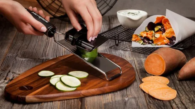 Der Gourmet Hobel ist nicht verstellbar und schneidet Scheiben von 2 mm Dicke.