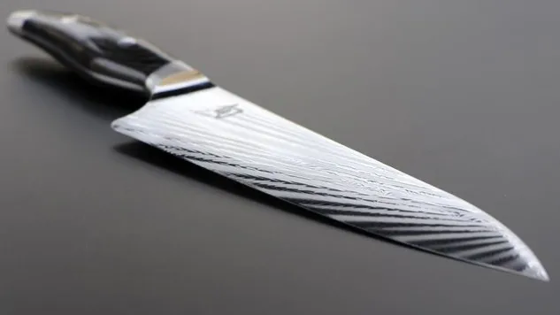 Die Klinge des Nagare Kochmessers besteht aus zwei miteinander verarbeiteten Stahlsorten (VG-10 & VG-2). Dadurch erreicht das Nagare Kochmesser eine Klingenhärte von 61 HRC. Das strahlenförmige Klingenmuster entsteht durch aufwändiges Schichten während dem Herstellungsprozess.