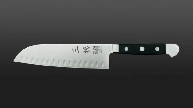 Die Klinge des Santoku Kullen Alpha ist mit praktischen Kullen ausgestattet. Hergestellt wird das Santoku Kullen Alpha von der traditionsreichen Messerschmiede Güde in Solingen.