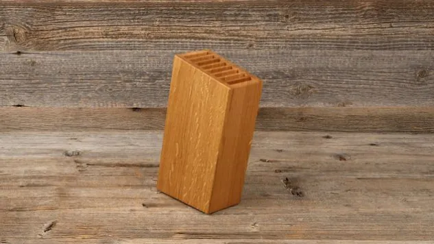 Der Schweizer Messerblock wird in der Schweiz aus Schweizer Eichenholz hergestellt. Insgesamt bietet der Schweizer Messerblock Platz für acht Kochmesser.