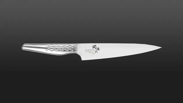 Das Shoso Allzweckmesser hat eine rostfreie Klinge mit einer Stahlhärte von 58 HRC. Der ergonomisch geformte Griff des Shoso Allzweckmessers mit dem Rautenmuster liegt angenehm in der Hand.