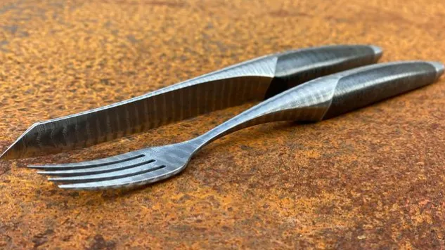 Das hochwertige Steakbesteck Damast wird in der Schweiz aus besten Materialien hergestellt: Das zweiteilige Steakbesteck Damast beinhaltet Steakmesser- und Gabel, mit Klingen aus über 1000-lagigem, korrosionsbeständigem Torsionsdamast. Torsionsdamast ist Stahl, welcher aus zwei Metallen (RWL 34 und PMC 27) in einem speziellen Schmiedeverfahren miteinander verbunden wird. Dadurch erhält jedes Besteckteil ein einzigartiges Muster.