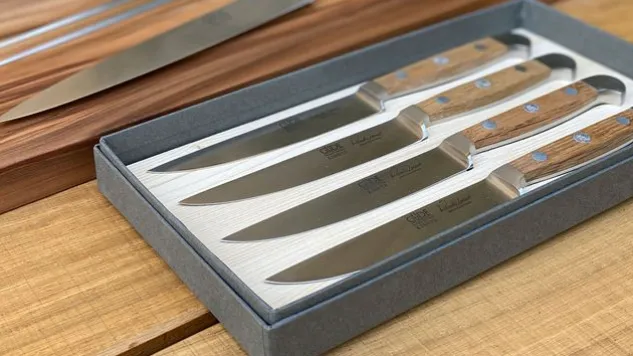 Vier Steakmesser sind im Steakmesserset Eichenholz enthalten. Das Steakmesserset Eichenholz wird von der Manufaktur Güde in Solingen hergestellt.