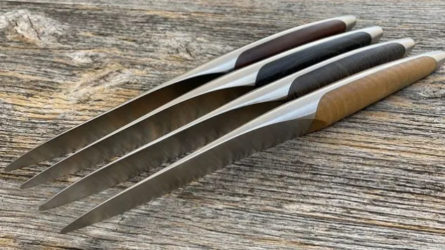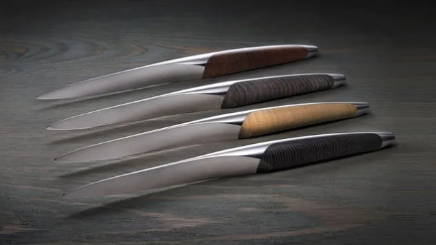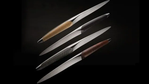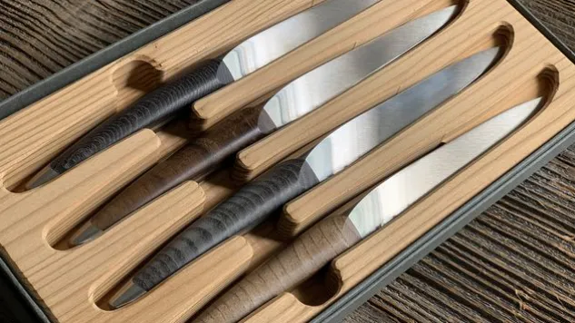 Das Tafelmesserset assortiert wird im Emmental aus Chirurgenstahl geschmiedet. Das Tafelmesserset assortiert bietet eine Auswahl an Messern, welche speziell für die weltbesten 3-Sterne Restaurants entwickelt wurden: Die Ausführung in stabilisiertem, schwarz eingefärbtem Eschenholz für Grant Achatz USA, Esche grau für Franck Giovannini Crissier, Esche hell für die Roca Brüder Girona und Walnuss für Mauro Colagreco Menton.