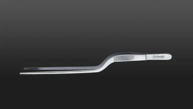 Die kleine triangle® Pinzette gekröpft hat eine Gesamtlänge vom 14 cm. Die vordere Greiffläche der triangle® Pinzette gekröpft ist geriffelt für besseren Halt der Speisen.
