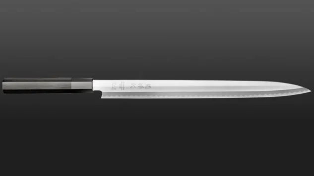 Die 30 cm lange Klinge des KK Yanagiba extra lang ist perfekt zum Filetieren von Fisch. Die einseitig geschliffene Schneide des KK Yanagiba extra lang ist aus rostfreiem Carbonstahl gefertigt und ist mit einer weichen, wellenförmigen Linie als satiniertes Finish verziert.