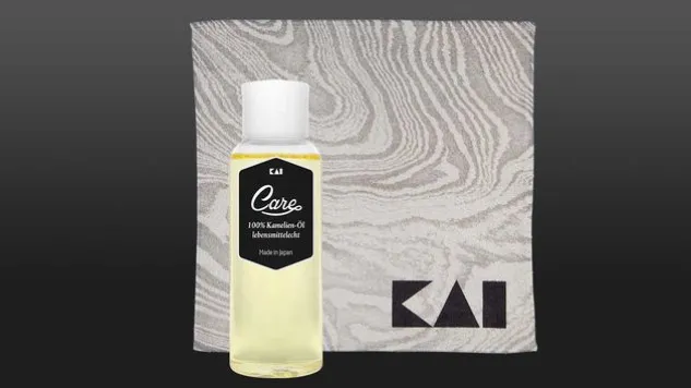 Das Klingenpflege-Set von Kai besteht aus einem Öl und einem Pflegetuch. Mit dem Klingenpflege-Set beugt man Rost und Flecken auf Damastmessern vor und sorgt für ein schönes Bild der Damaststruktur.