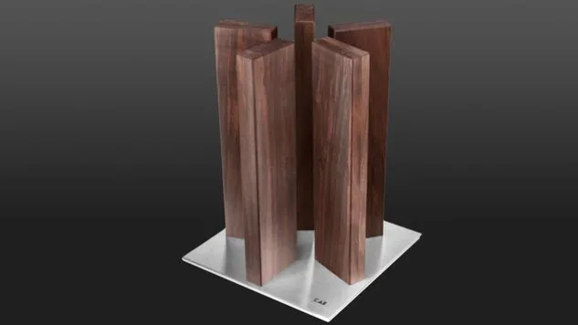 Der Messerblock Stonehenge von Kai hat 5 Holzsäulen, welche Platz für bis zu zehn Messer bieten. Dieser Messerblock Stonehenge besteht aus edlem Walnussholz mit einer Edelstahlplatte als Fuss.