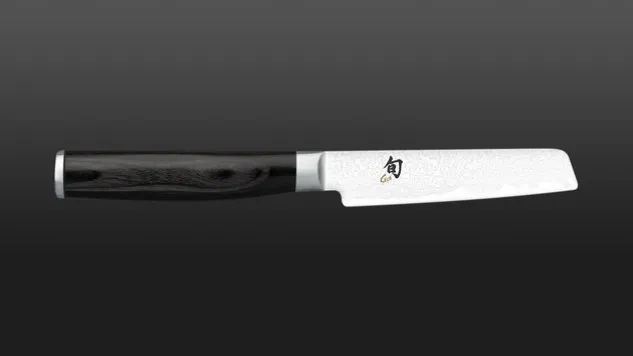 Mit dem Minamo Officemesser besitzt man einen kleinen aber feinen Küchenhelfer. Mit der geraden Klinge schneidet das Minamo Officemesser schnell und filigran Schneidgut wie Gemüse, Früchte oder Kräuter. Die 32-lagige Damastklinge hat eine Härte von 62 HRC und ist rostfrei.