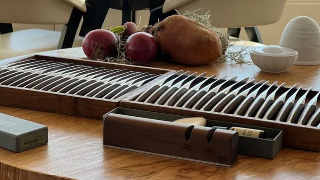 Mit dem Pflegeset mit Schleifgerät hat man alles zur professionellen Messerpflege zur Hand: Mit der Stufe 1 des Pflegesets mit Schleifgerät wird die Klinge vorgeschliffen und mit Stufe 2 (Polierstein) wird die Schneidkante poliert.