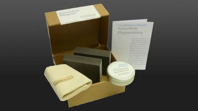 Das Pflegeset ist das richtige Hilfsmittel, um Verschmutzungen, matte Stellen oder Kratzer auf der Oberfläche zu beseitigen. Somit sorgt das Pflegeset mit seinen Komponenten für eine lange Lebensdauer der Schneidbretter.