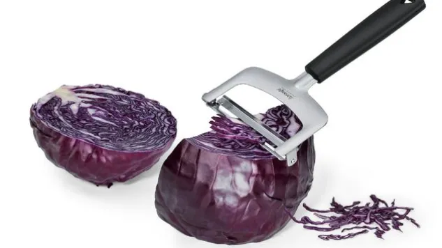 Das Scheibenschneider Set schneidet mit seinen drei auswechselbaren Klingen verschieden dicke Scheiben: 1,2 mm, 2 mm und 3,5 mm. Mit dem Scheibenschneider Set lassen sich hervorragend Zucchinis, Auberginen, Möhren oder Rettich verarbeiten.