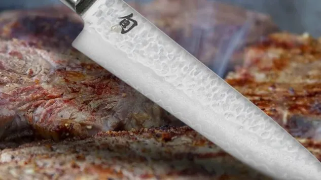 Die Hammerschlagoberfläche der Klingen des Shun Premier Steakmesserset ist ein echter Hingucker und der edle Pakkaholz-Griff (Walnussschichtholz mit Kunststoff infiltriert) sorgt für guten Halt beim Schneiden.
