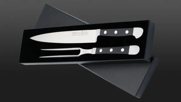 Das Tranchierset Alpha beinhaltet ein Schinkenmesser und eine Fleischgabel. Das Tranchierset Alpha ist ein beliebtes Duo, auch als Geschenkidee.