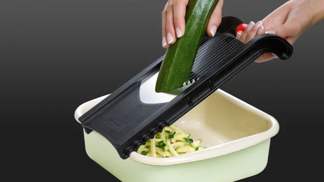 Der triangle® Gemüsehobel verfügt über zwei auswechselbare Einsätze und schneidet gleichmässige Scheiben in 1, 3 und 5mm Dicke sowie 4 x 4mm Julienne. Die Einsätze des triangle® Gemüsehobels sind dank den Aufbewahrungsschienen im Gehäuse kompakt aufbewahrt und immer zur Hand. Ein Restehalter, Auflagerillen für Schüsseln und ein rutschfester Griff sorgen für sicheres Arbeiten, während der stabile Klingenschutz dauerhaft die extreme Schärfe der Klinge erhält und vor unbeabsichtigten Verletzungen schützt.