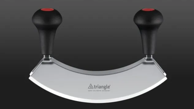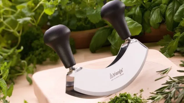Das triangle® Wiegemesser zweischneidig hat zwei Klingen aus gehärtetem Edelstahl. Mit den praktischen Griffen des triangle® Wiegemesser zweischneidig lässt sich schnell alles zerkleinern.