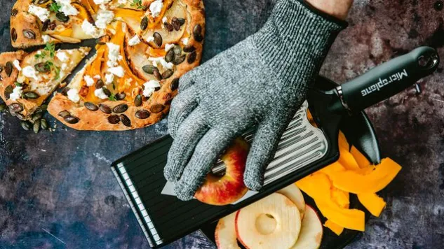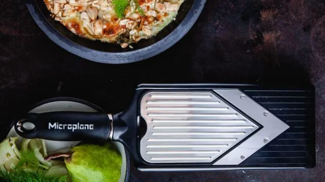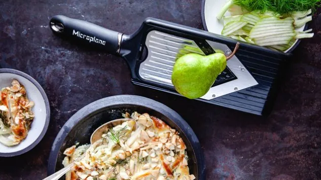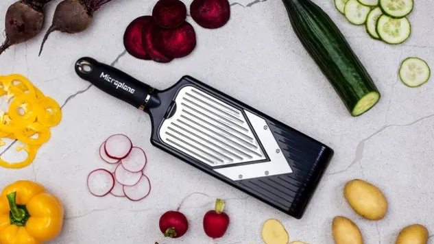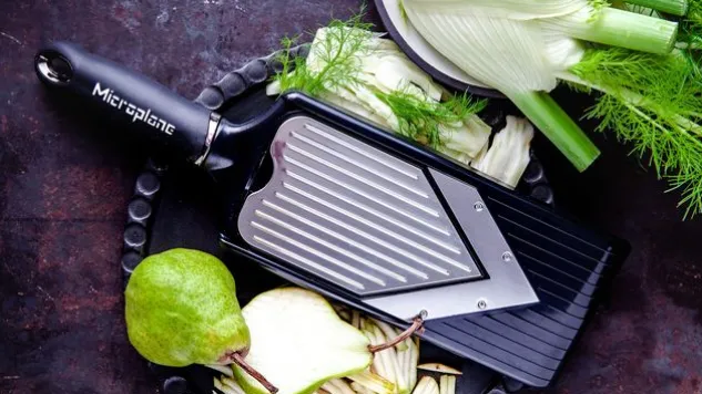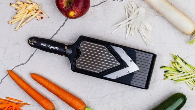 Die langlebige, ultrascharfe V-Klinge des kompakten, verstellbaren Microplane® V-Hobels schneidet mühelos und präzise Obst und Gemüse in Scheiben. Mit dem integrierten Julienne-Schneider des V-Hobels schneiden Sie Zutaten in lange, gleichmässige Streifen.