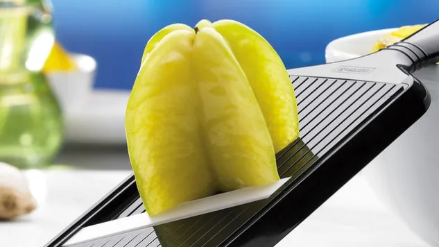 Der 4-stufig (0,5 mm, 1,3 mm, 2 mm und 3 mm) verstellbare Gourmethobel mit superscharfer High-Tech Keramikklinge schneidet hauchdünne Trüffelscheiben, feinste Zwiebelringe bis hin zu Gurken und Kartoffeln in den gewohnten Dicken.