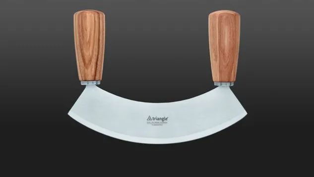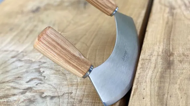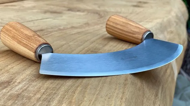 Das Wiegemesser Holz verfügt über angenehme Griffe aus Esche. Mit dem Wiegemesser Holz zerkleinert man mühelos Kräuter, Nüsse, Knoblauch oder Zwiebeln.