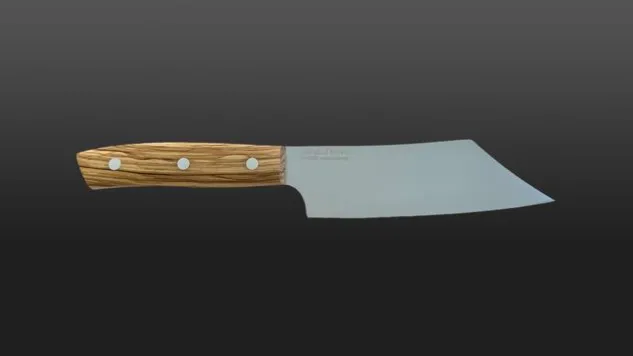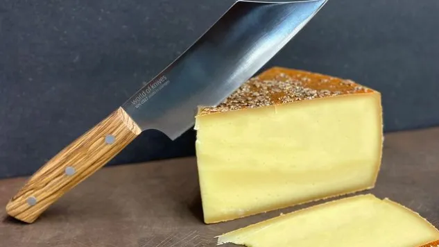 Der Griff des Wok Käsemessers besteht aus gemasertem Olivenholz. Dieses Wok Käsemesser eignet sich perfekt, um einen Käselaib zu proportionieren.